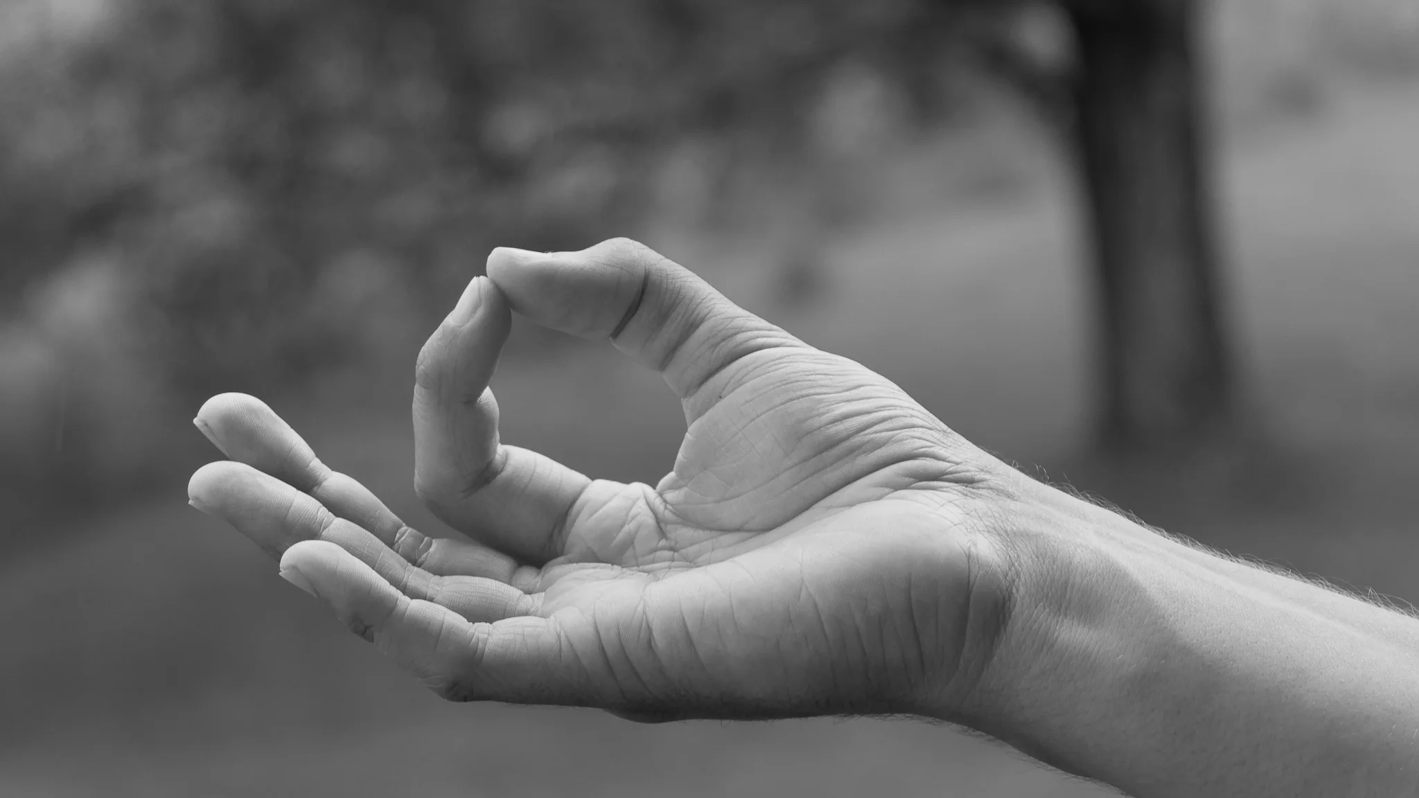 Chin Mudra: Die Zeigefingerspitze berührt das erste Gelenk des Daumens, wobei der Daumen mit leichtem Druck auf den Zeigefingernagel gelegt wird. Diese Haltung ist aktiv und gebend.